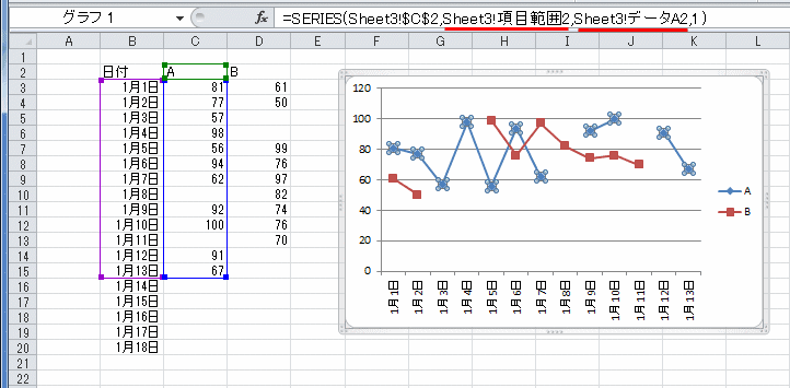 - =SERIES(Sheet3!$C$2,Sheet3!項目範囲2,Sheet3!データA2,1)