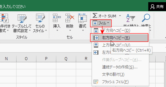 - [ホーム]タブの[フィル]→[右方向へコピー]をクリックします。
