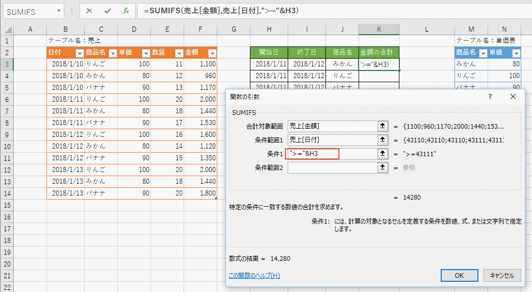 K3セルの数式は =SUMIFS(売上[金額],売上[日付],">="&H3,売上[日付],"<="&I3,売上[商品名],J3) となります。