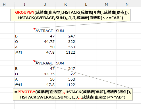 M4セル =PIVOTBY(成績表[血液型],,HSTACK(成績表[年齢],成績表[得点]),HSTACK(AVERAGE,SUM))