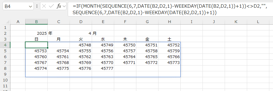 - B2セルに =SEQUENCE(DAY(EOMONTH(DATE(2025,4,1),0)),,DATE(2025,4,1)) と入力します。
