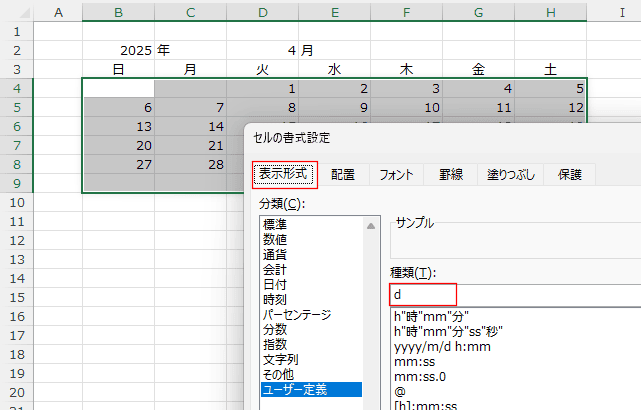 - 作成され日付のセルの表示形式を変更する必要があります。
