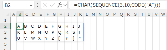 B2セルは =WRAPCOLS(CHAR(SEQUENCE(26,,CODE("A"))),10,"") としています。