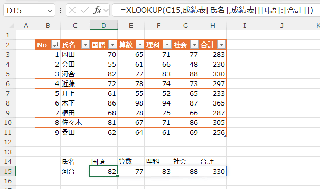 D15セルに =XLOOKUP(C15,成績表[氏名],成績表[[国語]:[合計]]) とします。