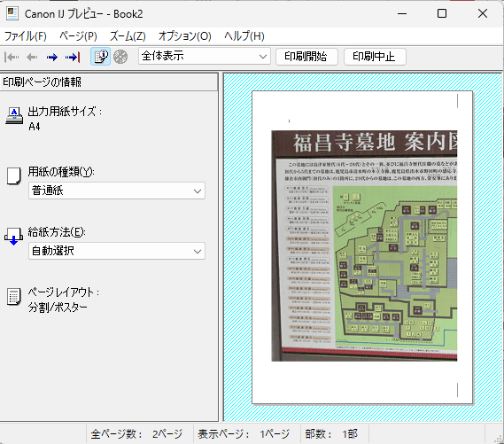 プリンターの印刷プレビューです。A4の2枚に分割して印刷ができます。