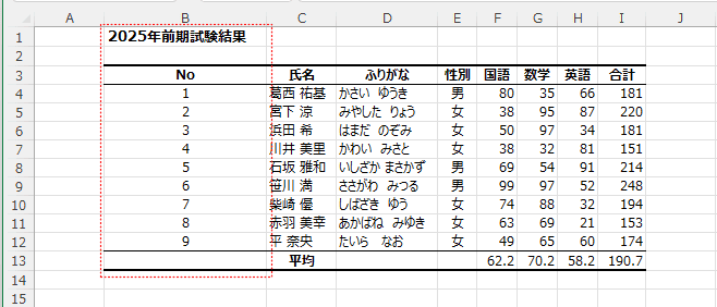 - 2行目が空行となっているので、表内のセルを選択して、[Ctrl]+[A] または [Ctrl]+[Shift]+[*] で選択することができます。