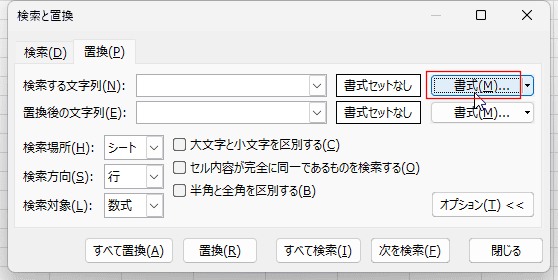 前に検索した書式がセットされたままになっていますのでクリアする必要があります。
