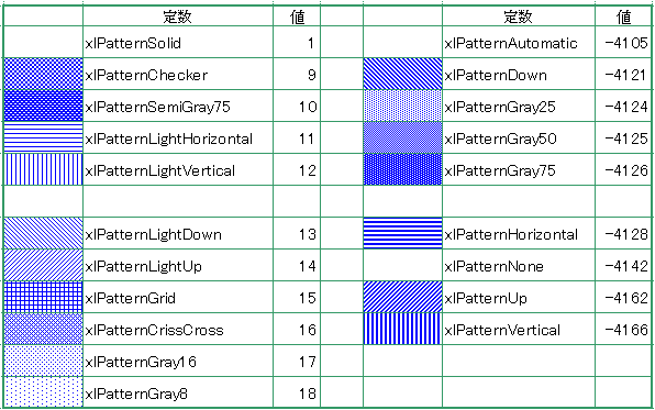 | xlLineStyleNone | 線無し | xlDiagonalUp | 左下から右上への斜線 | ||