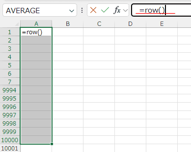 A1:A10000が選択できますので、数式バーに =row() と入力して、[Ctrl]+[Enter]で確定します。