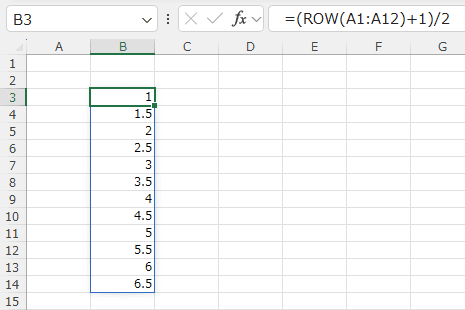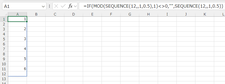 =IF(MOD(SEQUENCE(12,,1,0.5),1)<>0,"",SEQUENCE(12,,1,0.5))