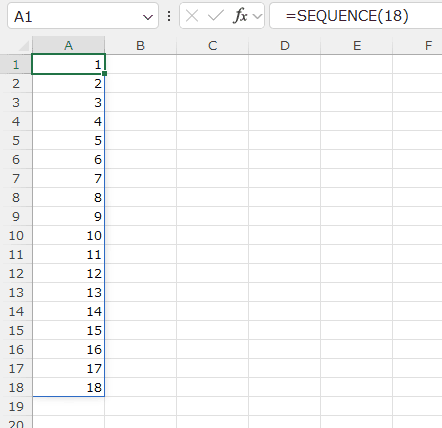 A1セルに =SEQUENCE(18) と入力するだけで、1〜18の連番を作成できます。