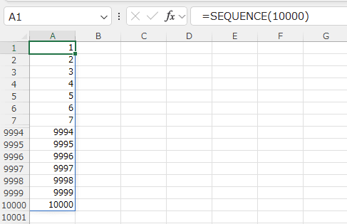 A1セルに =SEQUENCE(10000) と入力するだけで、1〜10000の連番を作成できます。