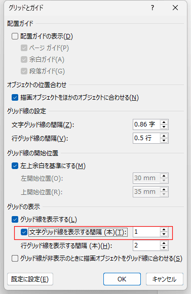 - [文字グリッド線を表示する間隔(本)]にチェックを入れ、数値を入力します。
