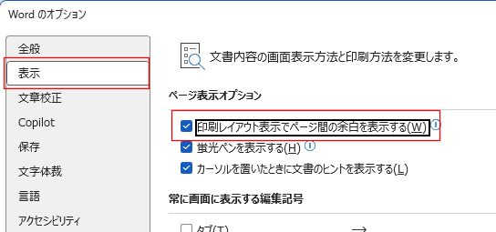 「印刷レイアウト表示でページ間の余白を表示する」にチェックを入れます。