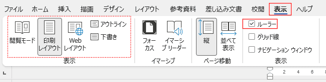 - [表示]タブの表示グループの「ルーラー」のチェックが外れていないか確認しましょう。