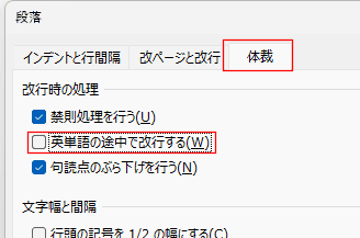 - [書式]→[段落]の「体裁」タブで「英単語の途中で改行する」のチェックを外します。
