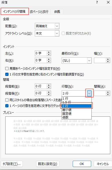 - [行間のオプション]を選択すると、段落ダイアログが表示されます。