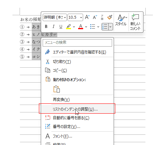 [リストのインデントの調整]を選択します。