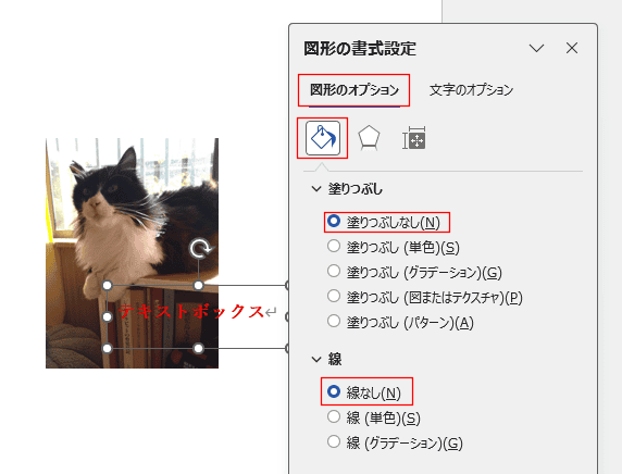- 線で「線なし」を選択して、テキストオックスの線を非表示にしました。