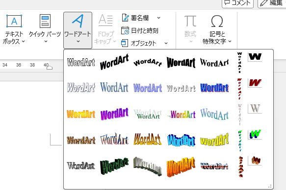 | ワードアートのツールバーの[テキストの編集]を選択して、文字を修正できます。 | [ワードアートギャラリー]ボタンを選択します。 |