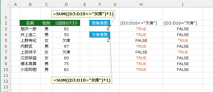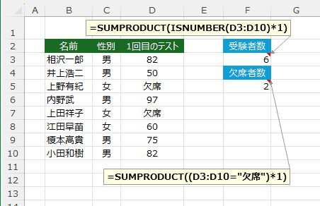 なお、=SUMPRODUCT((D3:D10<>"欠席")*1) と「欠席」でないとして計算することもできます。