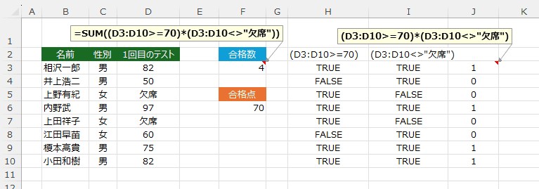 F3セルには =SUM((D3:D10>=70)*(D3:D10<>"欠席"))