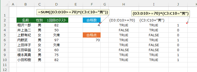 F3セルには =SUM((D3:D10>=70)*(C3:C10="男"))