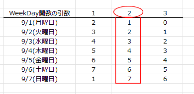 引数に2を指定すると、月曜日が1,火曜日が2,・・・,金曜日が5,土曜日が6,日曜日が7が返されます。
