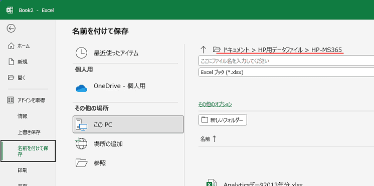 - ちなみに、[ファイル]タブから[名前を付けて保存]を選択する方法だと、下図のような画面で操作することになります。