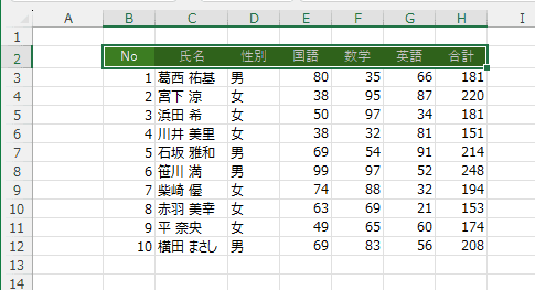 ここでは、B2セルを選択して、[Shift]+[Ctrl]+[→] でB2:H2セルを選択しました。