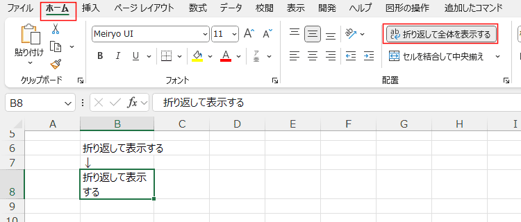 - [ホーム]タブの配置グループにある[折り返して全体を表示する]をONにします。