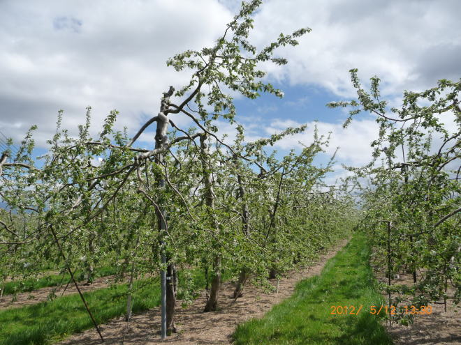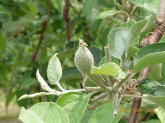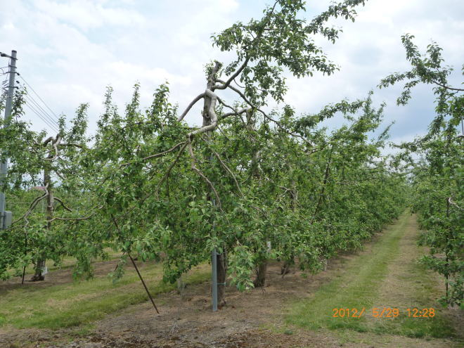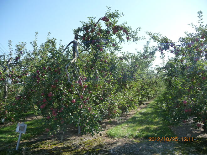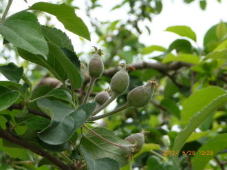 | 5月29日、りんごの木の選定に農園に行きました。昨年と同じ木4本を、私に若干の手違いがありましたが、農園主の大倉さんのおかげで無事にオーナーとして確保することができました。感謝です。その時に撮影した写真を掲載します。小さい実がすでに付いていました。そろそろ摘果作業が始まっているようです。 |