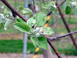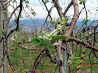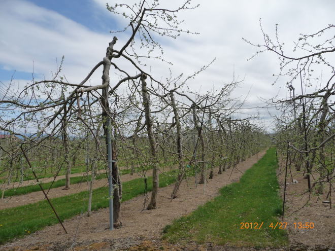 | 4月27日、りんご農園にりんごの木の様子を見に行きました。新芽が芽吹いている状態で、まだ花は咲いていません。例年花が咲くのは5月の上旬なので、そのころにまた来てみたいと思います。 |