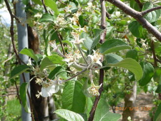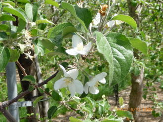 | 5月12日、遅かったか、りんごの花は散ってしまったかと気にしながらりんご農園に行きました。案の定すでに散り始めて、花は少なかったです。満開の時期を逸してしまいました。今年の実付きはどうなのでしょうか、心配です。残念ながら、りんご農園の方には会えませんでした。 |