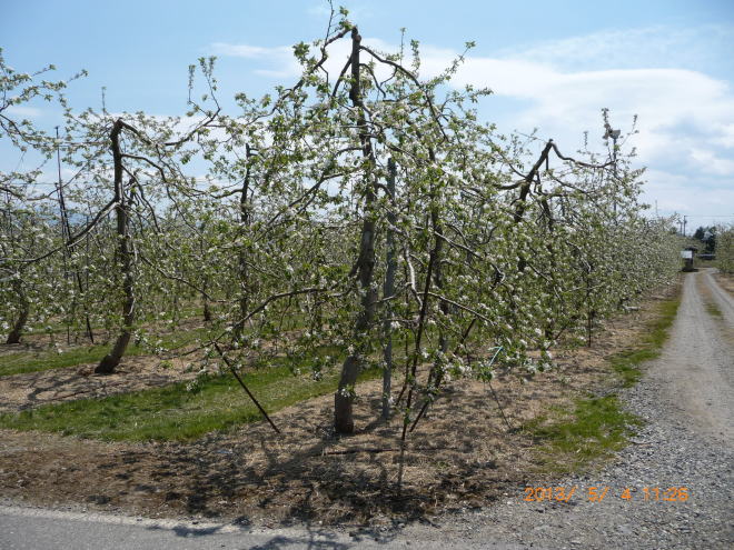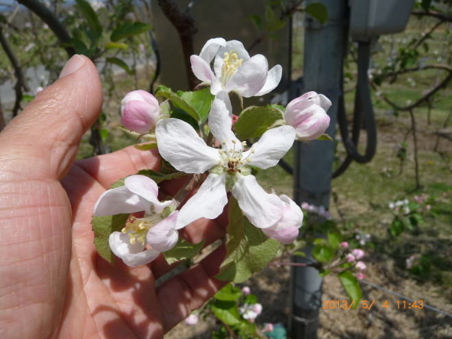 | 5月4日、穂高に移動後初めてりんご農園にりんごの花を見に行き、農園主の方が受粉作業をしていたので、話を聞くことが出来ました。今年は深刻です。『先月の低温と降雪で、通常実として残す最初に咲いた中心の花の雌しべがやられた。実にならない。周りに咲いた花がどの程度実になるか分からないが、受粉作業をやっている。こんなこと初めてだ。』との事でした。 最初の写真のように、花は結構咲いていますが、近付いてみると、葉に勢いが無く、花も萎れているように見えます。説明では、最後の写真のように中心に咲いている花の真ん中(雌しべ)が低温にやられ黒く変色してしまったものがかなり多く、この花は実にならないし、周りに花が実になっても形が悪かったりするということでした。 今後適時情報を発信していきます。 ちなみに、5月10日の信濃毎日新聞に載った記事を紹介します。見出しは『標高低いリンゴ被害深刻 中信先月の低温 県センター調査650メートル以下生育進み』、前文は『中信地方で4月21日〜22日の低温と降雪で大きな被害を受けた果樹について、リンゴの場合、標高650メートルより低い地域に大きな被害が目立つことが、県松本農業改良普及センターの9日までの調査で分かった。』、本文抜粋は『この地域はリンゴの生育が開花の前段階まで進んでいたためとみられる。これより標高が高い地域では被害が比較的少ない傾向で、・・・・本来果実にする花「中心花」で8割以上の被害を受け、その周辺の花「側花」でも6割以上の被害があり、「収量・品質に影響あり」と判断した果樹園は11カ所。・・・』とありました。 関連記事に、安曇野市管内の被害額は、主力品種の「ふじ」と「つがる」が計5億200万円、その他の品種でも4400万円、ナシは6800万円と見込まれるとありました。 |