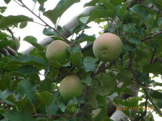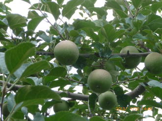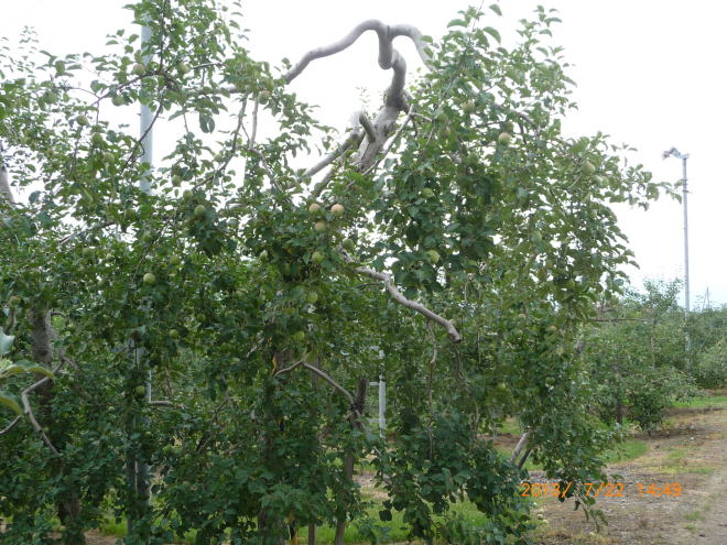 | 安曇野三郷のりんご農園に様子を見に行ってきました。りんごの木は例年のように一杯実を付けていました。『低温被害が深刻だ』と一時心配していましたが、状況は好転、例年通りの成長のようです。農園主の方とお話ししましたが、「初めてのことで心配したが、何とか持ち直した。一応ホットはしているが、今後台風が心配だ。」と話していました。 例年通りの収穫ができますように・・・。 |