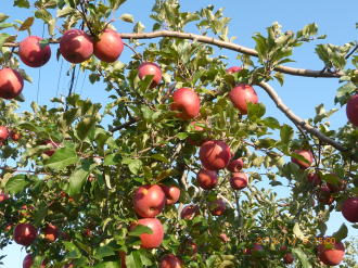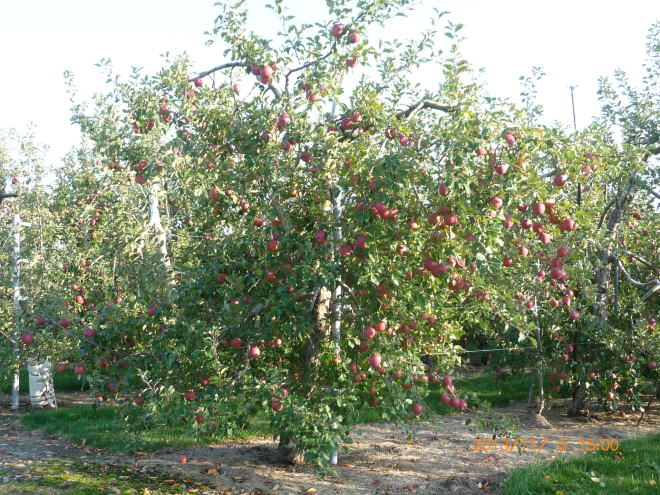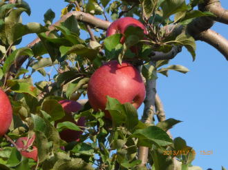 | 今年は11月9日、10日が三郷地区におけるりんごの木オーナー達の統一収穫日です。5日に収穫直前のりんご状況を農園に見に行きました。赤く沢山実っています。春に冷害に見舞われましたが、持ち直し、赤く熟し、収穫されるのを待っています。「粒は全体的に小ぶりですが、蜜が入っていて美味しいですよ。収穫数は多いと思います。」と農園の方が話していました。楽しみです。 |
