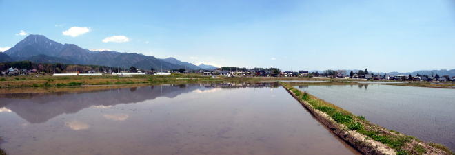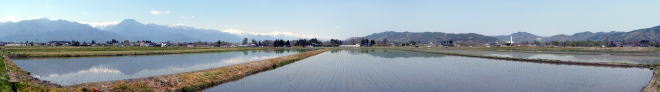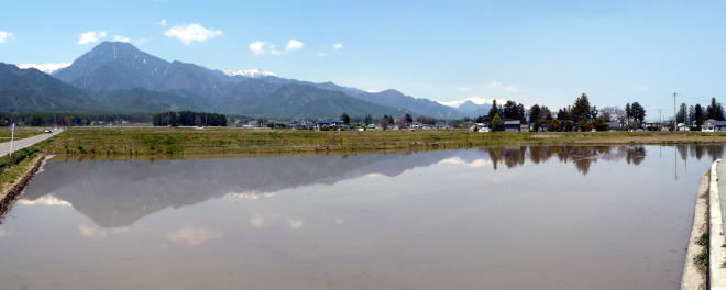 1枚目と2枚目は、穂高有明の田圃と北アルプスのパノラマ写真です。既に田植えが終っている所もありました。3枚目は御宝田の田圃と北アルプスの180度のパノラマ写真です。4枚目と5枚目は御宝田の田圃、6枚目は有明の田圃で田植え中の様子を撮りました。一家総出で作業をしているようです。