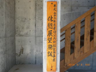 5月6日、今年初めて長峰山に登り、新しい展望台を目の当たりにしての感想は『おお!結構立派。』です。1階部分はコンクリートで固めてあり、その上は太い頑丈そうな木材で組んであります。最上階(3階位)は中央が休憩場所(テーブル、ベンチ)に、周りがぐるり展望回廊になっています。以前建っていた展望台は華奢な感じで今にも壊れそうで怖かったし、周りの木が邪魔をして展望が良くなかったので、利用は1回のみで、一昨年頃から利用禁止になっていました。