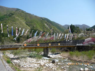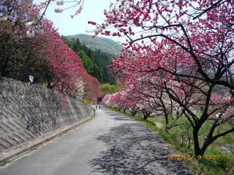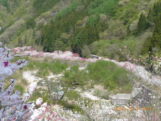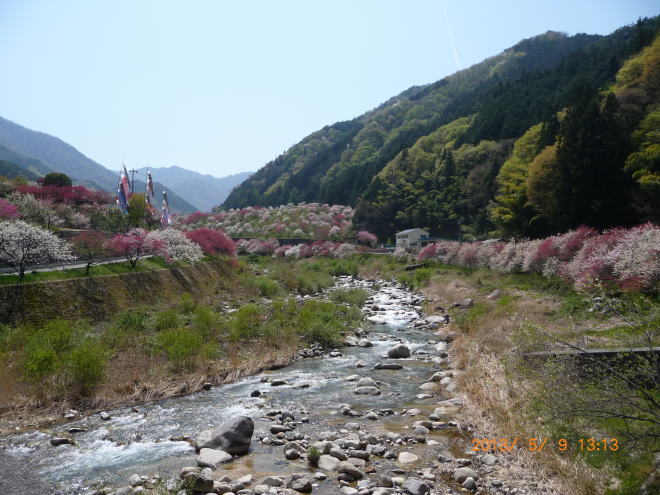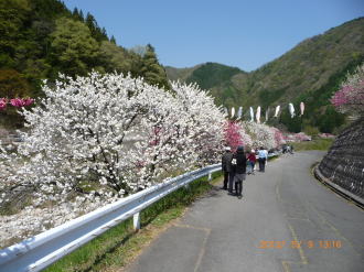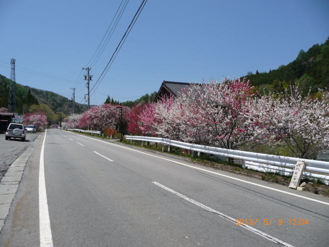 5月9日、「阿島の大藤」の撮影後、清内路村、阿智村の「花桃」を見に行きました。18号線(伊那街道)の阿島から元善光寺方面へ、座光寺交差点で153号線(三州街道)に出て飯田方面へ、この153号線沿いに花桃が植えられているとの情報ですが、もう終ってしまったのか、目立つ花桃の並木は目に付きません。153号線から256号線へ、道の両側に花桃がと車を止めたのが、最初の写真にある清内路村上清内路の「峠の本陣」という土産と食事の施設でした。この程度だとわざわざ来た意味が無いなと思い、店員さんに花桃の見頃になっている所を尋ねてみたら、「月川温泉が丁度見頃ですよ」と教えてくれました。256号線を戻り、昼神温泉の手前を右折し、しばらく行ったところに月川温泉があります。「花桃まつり」をやっていて多くの観光客が来ていました。