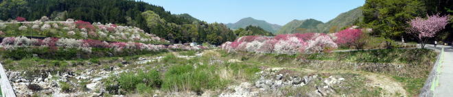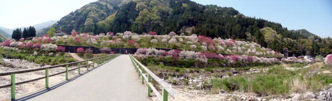 まつり本部、売店の近くの有料駐車場(500円)に車を止め、早速散策です。花桃は満開を若干過ぎたような状態でしたが、十分綺麗です。2枚目はまつり本部の近くから撮った様子です。花桃だらけ、良くこれだけ植えたなと関心しました。本部の前においてあった案内図にある遊歩道を順路案内板にあわせて巡ってみました。3枚目から7枚目までは、橋を渡り、川沿いのゆるい上り坂(右側は川、左側は上の旅館の石垣)の両側に植えてある花桃を撮っています。ここの花桃が満開状態で、最も綺麗でした。坂を上りきったところに「花桃の里」という看板が立っていて(8枚目)、この先に「旅館月川」があります。9枚目と10枚目は、上りきった所にある橋から、対岸の車道方向とまつり本部方向を撮ったパノラマ写真です。11枚目から14枚目までは、順路通りに歩いていて気に入った花桃の景色を撮影ました。13枚目の川の向こうに見えている花桃が15枚目以降の花桃です。最初に渡った橋の上には沢山のこいのぼりが泳いでいました(14枚目)。15枚目と16枚目は月川温泉入り口の橋近くの花桃(対岸)です。ここの花桃が綺麗な並木になっていたのでパノラマ写真にしてみました。最後の写真です。