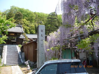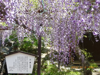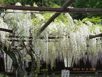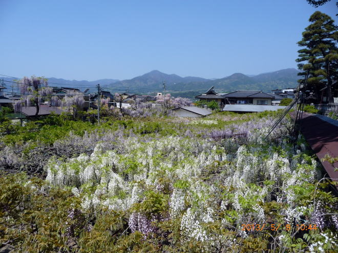5月9日(木)、下伊那郡喬木村阿島の大藤を見に行きました。長野道、中央高速で松川ICまで行き、153号線(三州街道)に降り、吉田の交差点を左折、天竜川を渡り、田村の交差点を右折して18号線(伊那街道)に入ります。阿島の大藤は伊那街道の阿島交差点手前を左に入った所の安養寺の下にあります。安養寺の境内が駐車場になっていました。