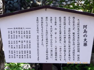 最初の2枚は安養寺と大藤入り口を撮ったものです。次の3枚は藤棚の下に立っていた2つの説明版、「阿島の大藤」の説明版、山藤(原種)の説明版、山藤(原種)です。次の4枚は、入り口から時計と反対周りに回りながらほぼ4隅で撮った藤棚全体の写真です。次の5枚は綺麗に咲いている藤をアップして撮りました。紫、八重、紫、ピンク、白の藤の花です。次の1枚は藤棚を上から撮ったものです。手前の白い藤は、藤棚の下では余り咲いていないように感じたのですが、上から見ると藤棚の上で見事に咲いていました。最後の2枚は、阿島交差点の角にある商店に道を聞いた時、親切にも商店の駐車場を貸してくれたのですが、そこに歩いて帰る途中にあった「阿島陣屋跡」を撮ったものです。どこにも興味深い歴史があるものですね。
