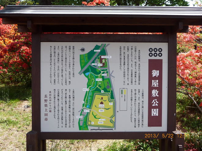 案内書によると「御屋敷公園」は『真田氏が上田城を築城する前に居住していた館跡と考えられている。東西150m南北130mのやや台形の敷地の周りに土塁を廻らせ、南側に大手門があって枡形も残っている。上田移転の折、この地が荒れるのを憂えた真田昌幸によって皇太神社が祭られ、現在は御屋敷公園として整備されツツジの名所として名高い。』と説明されています。