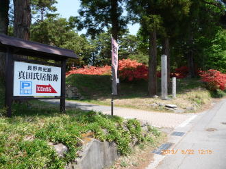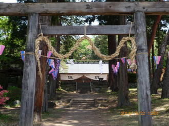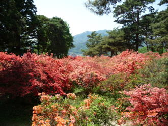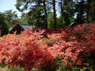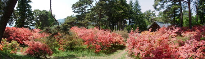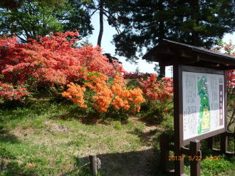 つつじの名所というだけあって、最盛期を迎えていた景観は見事です。種類は山ツツジと紹介されていました。館跡の皇太神社を取り囲むように植えられていて、つつじのトンネルをくぐりながら、見事に咲きそろった花を楽しむことが出来ます。つつじに囲まれたエリアでは、火気禁止ではないようで、コンロ使ってバーベキューを楽しんでいたおじさん・おばさんグループがあり、大声で歓談していました。この場にはチョッとそぐわないかな〜。