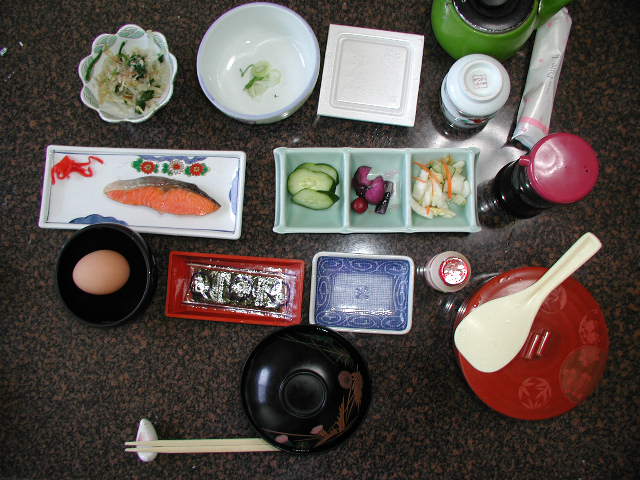 朝食は、純和風。塩鮭、納豆、海苔、生卵、おひたし、漬物に、味噌汁、ごはん。なぜかヤクルトが付く(!?)