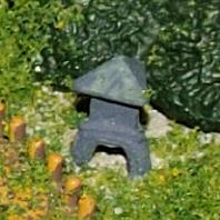 池に片足を入れた灯籠はまるで兼六園だ | 植え込みに隠れた小さな灯籠 | 巨石に見えるのは1.5cmくらいの小石 | ||||||
