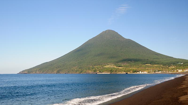 指宿スカイラインの山道から見た夕暮れの開聞岳遠望 ↓ |