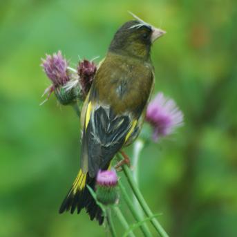 図鑑で名前を調べるほかなかった。くちばしの形、羽根の色からカワラヒワと特定した 左写真、額に立っている白い毛は、ついばんだ野あざみ | ||||||