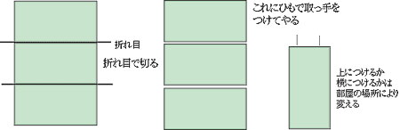 ます。その、折り目の所から切り、3つに分けます。それに、ひもなどで引っかける所をつけ、壁にぶら